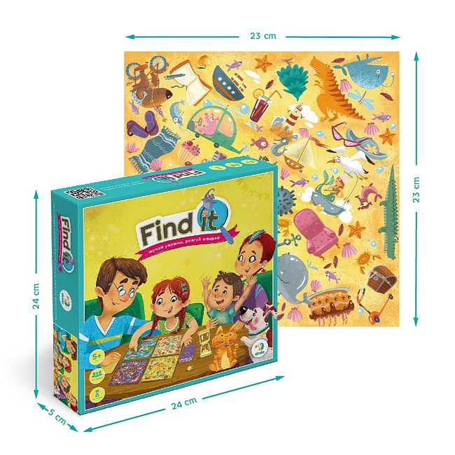 Мета гри — якнайшвидше знайти загадані на картках предмети на ігровому полі та зібрати 10 карток. Ігрові поля можна перемішувати, прибирати та додавати за бажанням, тож гра може бути різної складності та змінюватися, щоб довго не наскучити. Find it стане ідеальною розвагою як і для малюків, так і для всієї родини.