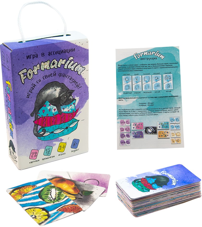 «Formarium» – фантастическая карточная игра в ассоциации. В игре вы найдете 72 карточки, среди которых будут карты с рисунками и карты с различными свойствами. Цель игры – угадывать свойства карточек в центре стола, так же, как и большинство игроков. В ситуации, когда все игроки выложили одинаковое свойство, или все разное – никто не зарабатывает баллы. С этой игрой вы убедитесь, что каждый человек в одинаковых предметах видит абсолютно разные формы и характеристики! Это очень увлекательно!