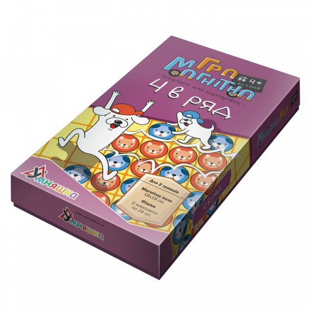 Гра магнітна 4 в ряд Ранок. Гра магнітна "4 в ряд". Мета гри: на полі в 42 клітини викласти 4 поспіль фішки свого кольору по горизонталі, вертикалі або діагоналі, одночасно не давши зробити це своєму противнику. Завдяки магнітним полю і фішкам, а також компактному розміру, гра ідеально підходить для подорожей! Cклад: магнітне поле 18х18 см, 2 комплекти фішок по 24 шт.
