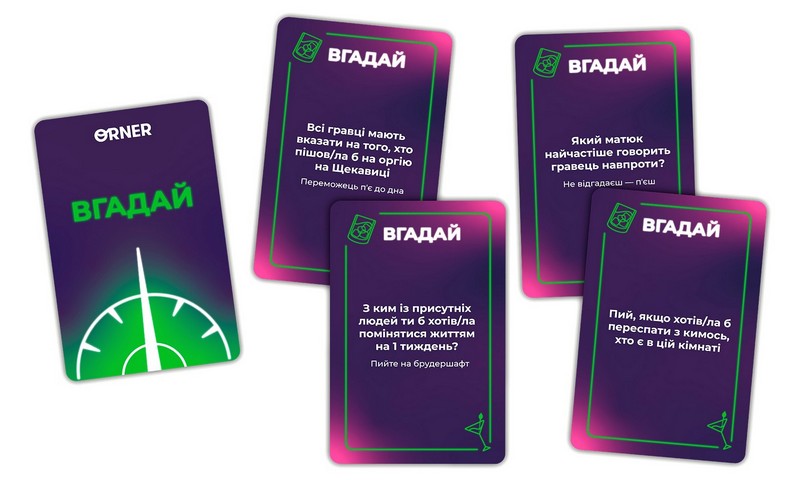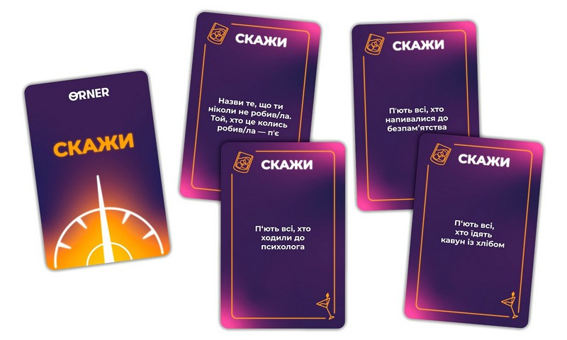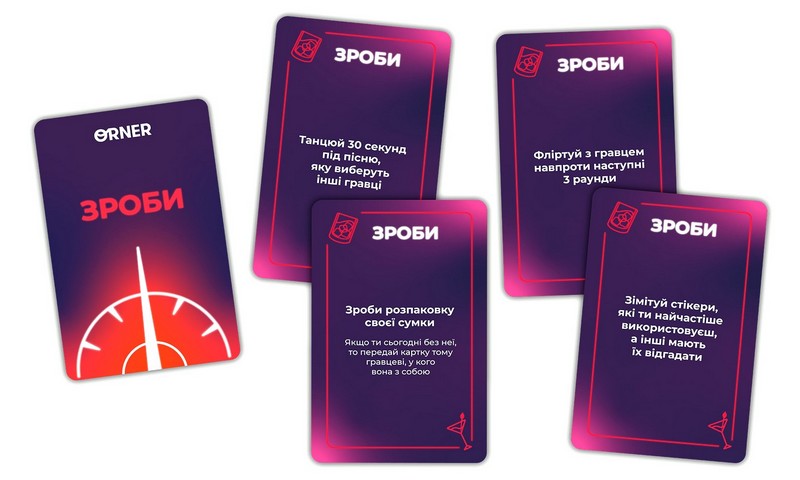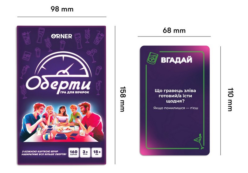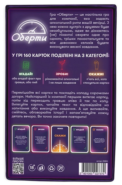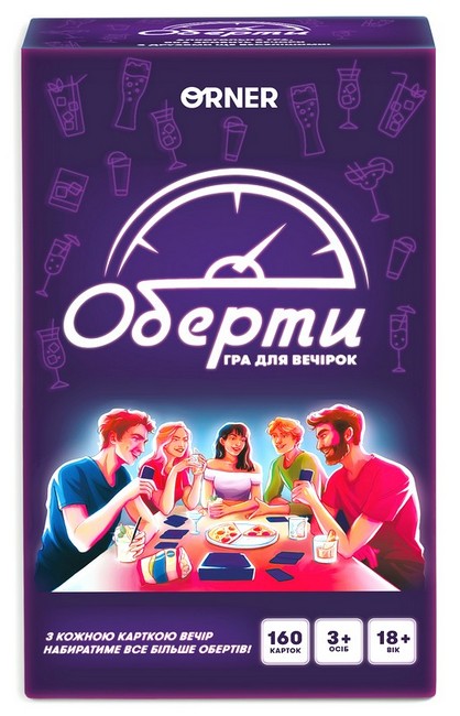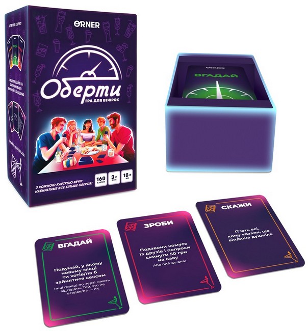 Гра для компанії «Оберти» — це 160 карток, які перетворять вашу вечірку на справжнє шоу! А кожен з трьох розділів (Вгадай!, Зроби!, Скажи!) має картки, що розроблені для того, аби ваша вечірка стала дійсно WOW.