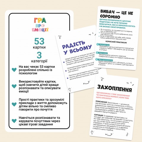 - У цій грі є 53 картки для розвитку IQ та емоційного інтелекту вашої дитини!