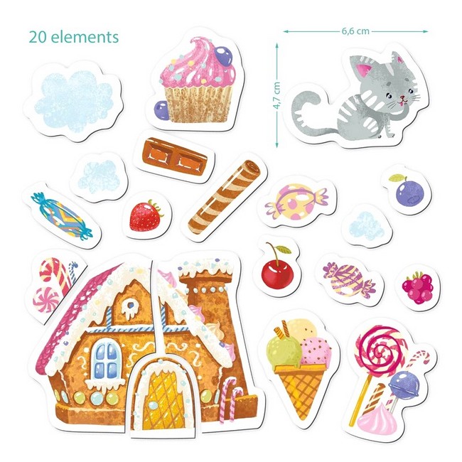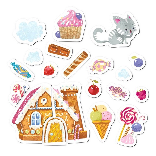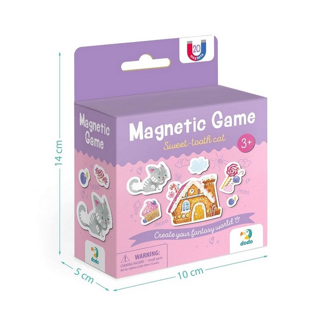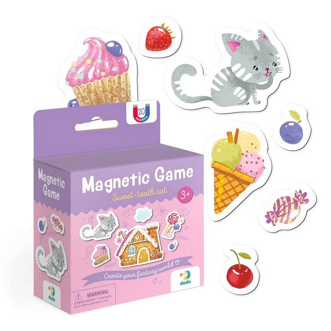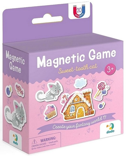 У наборі міститься 20 магнітних елементів, які включають в себе чарівного котика, пряниковий будиночок та смачні солодощі. Магніти прекрасно тримаються на магнітній поверхні, і малеча може створювати нові сюжети, вигадувати історії і розвивати фантазію. Крім того, гра з магнітами сприяє розвитку дрібної моторики рук та координації.
