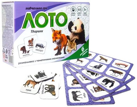 «Лото – Тварини» – настільна навчальна гра, яку люблять не тільки маленькі діти. Відійшовши від класичного варіанту, дитина зможе познайомитися не тільки з літерами, але й з видами тварин, накриваючи на картках необхідні малюночки. Граючи з лото, малюк вивчить нові слова і розширить свій кругозір. Не залишаться без уваги такі навички, як уважність, посидючість і моторика рук. У грі «Лото – Тварини» є також додаткові завдання і розмальовка.