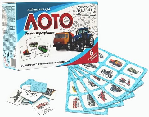 «Лото – Засоби пересування» – настільна навчальна гра, яку люблять не тільки маленькі діти. Відійшовши від класичного варіанту, дитина зможе познайомитися не тільки з літерами, але й з різними засобами пересування, накриваючи на картках необхідні малюночки. Граючи з лото, малюк вивчить нові слова і розширить свій кругозір. Не залишаться без уваги такі навички, як уважність, посидючість і моторика рук. У грі «Лото – Засоби пересування» є також додаткові завдання і розмальовка.
