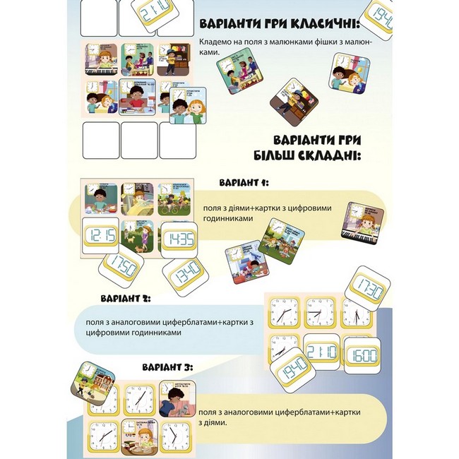 Поля та фішки містять повсякденні дії, зображення аналогових та цифрових годинників.