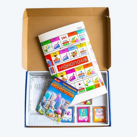 ігрове поле, картки менеджера (28 шт.), картки «Директор» (10 шт.), картки «Випадок»(25 шт.), картки «Клієнт» (10 шт.), картки «Імідж» (15 шт.), банкноти, кубики (2 шт.), фішки для гри (6 шт.), мініенциклопедія з правилами гри.