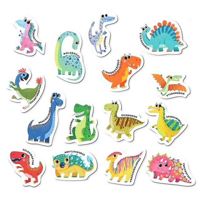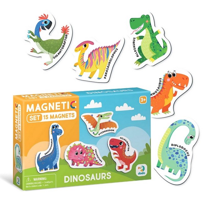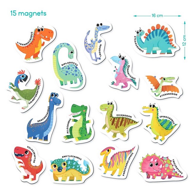 У наборі містяться 15 магнітів, кожен з яких представляє собою різних динозаврів. Кожен магніт супроводжується назвою динозавра, що сприяє розвитку мовних навичок дітей та розширює їхні знання про цих захопливих істот. Магніти легко прикріплюються до магнітної поверхні, що робить навчання цікавим та інтерактивним.