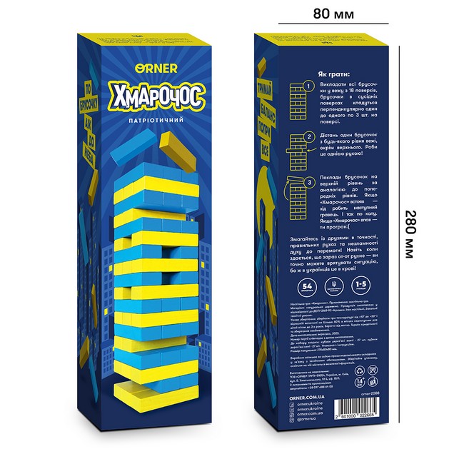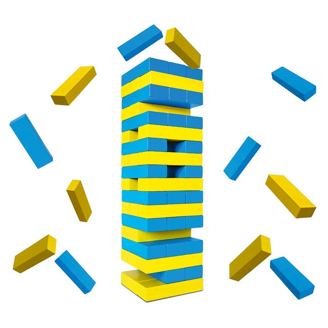 Гра дженга «Хмарочос» Патріотичний — гарний вибір для великої компанії. Звісно, ви можете потренуватися наодинці (бо грати можна від 1), але як же класно спостерігати: ось ваша (а чия ж) впевнена рука не менш впевнено дістає брусок та починає будувати 19 поверх.