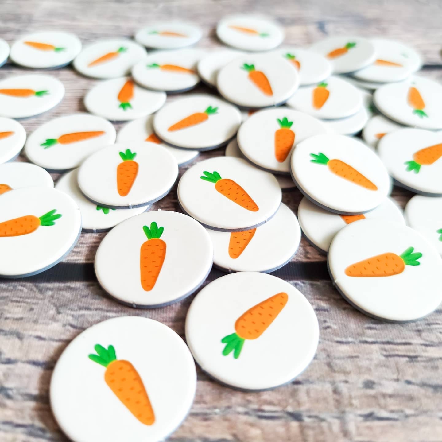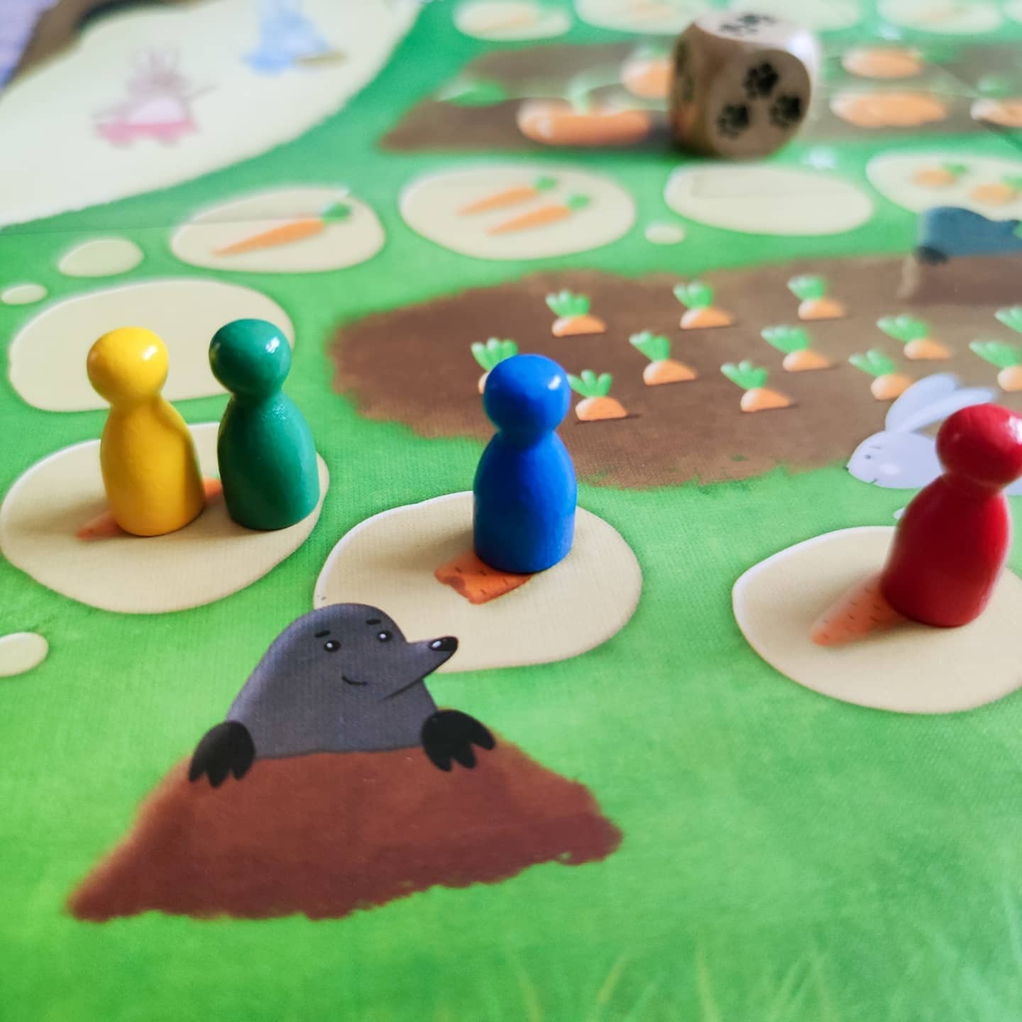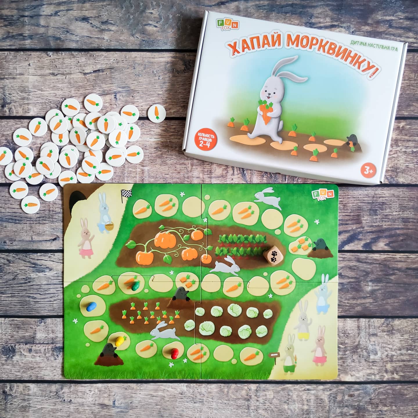 Чотири маленьких зайченяти направляються додому, де на них вже чекають батьки. Вони стрибають по стежці і збирають моркву. Але раптом між грядками з'являються кроти, які не хочуть пропускати зайчат. Хто першим добереться додому? А хто збере більше морквинки?