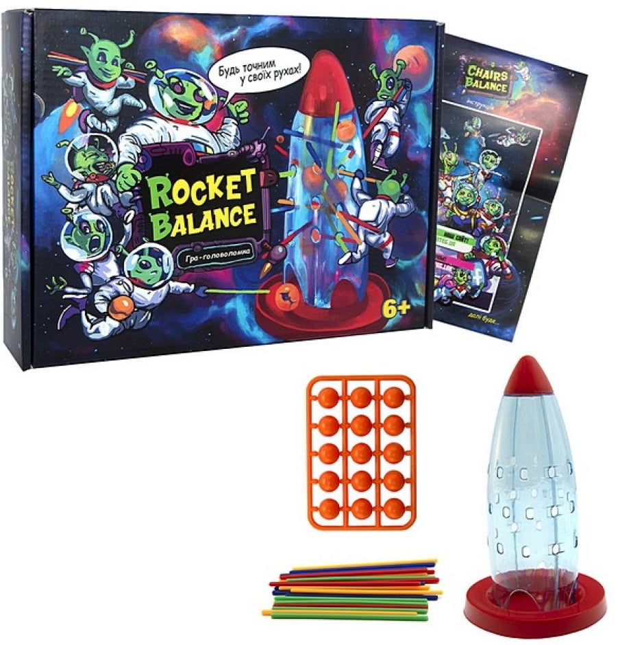 Продумати свої дії при будівництві міжгалактичного зорельота необхідно в грі-головоломці «Rocket Balance». Щоб допомогти прибульцям зібрати та запустити космічний корабель необхідно з'єднати між собою складові частини й завантажити його паливом. Спеціальні напрямні допоможуть розмістити паливні кульки в корпусі. Під час вилучення стрижнів кульки не повинні впасти. Така гра сприяє розвитку особистості та характеру малюка — посидючості, акуратності та наполегливості, а також розвитку колірного сприйняття, координації, уяви та логічного мислення, форму предметів і вмінню аналізувати. Всі деталі виконані з екологічно чистих елементів різних кольорів і упаковані в коробку з яскравими та веселими малюнками.