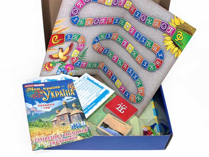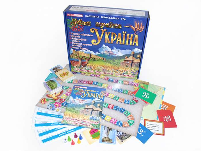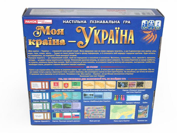 Настільна пізнавальна гра Моя країна Україна Ранок. Знайомить з народною творчістю та природними скарбами Батьківщини. У наборі 2 різні варіанти гри з різними ігровими полями, надрукованими на цупкому картоні: з льняною текстурою з цікавими завданнями та поле-карта.
