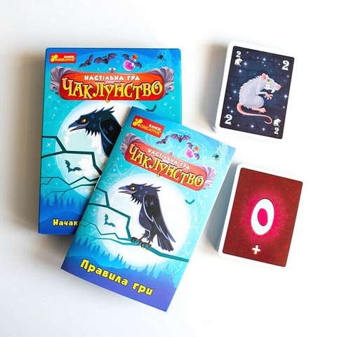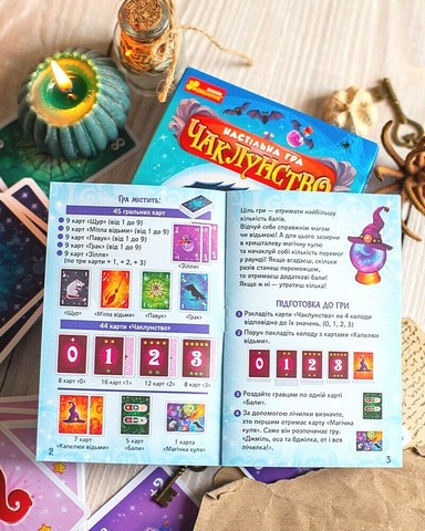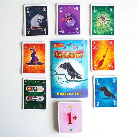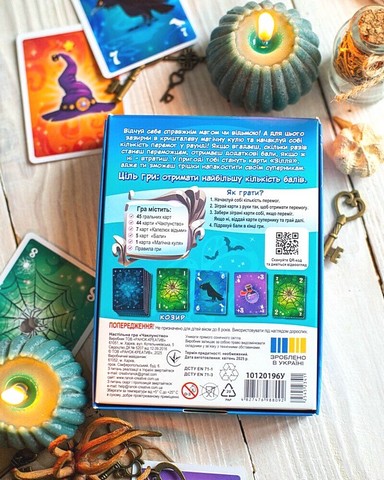 \nУ наборі: 45 гральних карт, 44 карти «Чаклунство», 7 карт «Капелюх відьми», 5 карт «Бали», карта «Магічна куля», правила.