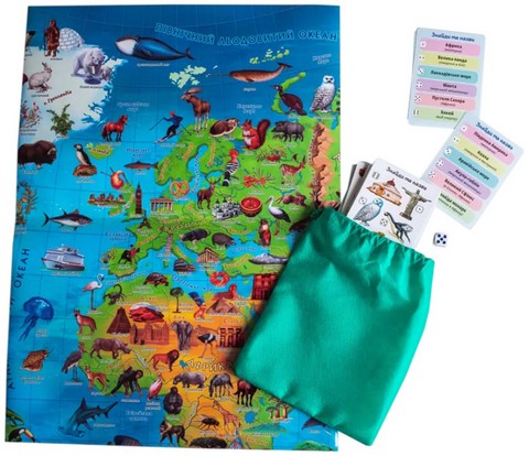 Гра включає величезну інтерактивну карту (880х610 мм)!, 50 двосторонніх карток та гральний кубик, що робить її не лише освітньою, а й надзвичайно розважальною. Скільки таємниць приховує світ? Чи знаєте ви, які тварини живуть в Австралії або де знаходяться найвідоміші пам’ятки? У нашій грі ви дізнаєтесь про континенти, моря, річки, визначні місця та багато іншого!