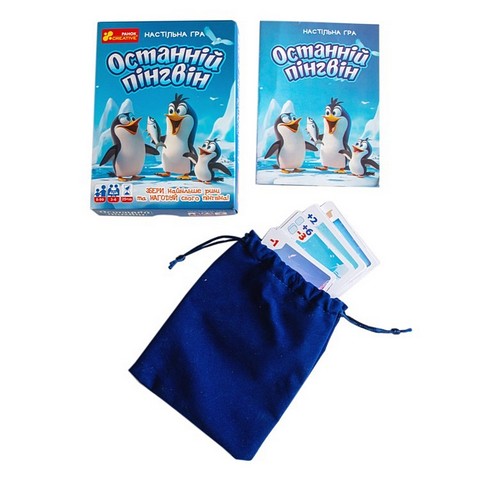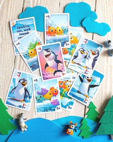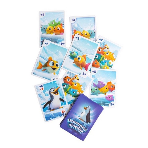 \nУ наборі: 24 картки (7 з рибою, 5 з пінгвінами, 9 із завданнями, 3 хижаки), велюровий мішечок для зберігання карток.