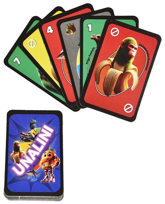 «Unalini» — це мемна карткова гра, де замість цифр і кольорів — суцільний італійський абсурд. Скидай картки за кольором або типом, використовуй спеціальні дії (пропусти хід, зміни напрям, +2, +4), і не забудь крикнути «Уналіні!», коли лишається одна карта. Ідеально для вечірок, тусовок із друзями й людей, які готові сміятись до сліз та перемагати.