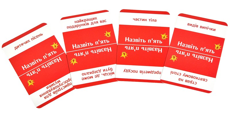Гравцям доведеться за 10 секунд називати по п'ять слів, які будуть відповідати заданій категорії. Наприклад, «назви 5 речей літнього гардероба» або «назви 5 чоловічих імен на букву А». Якщо, на перший погляд, вам здається це легким, то в процесі гри на час, це робити набагато складніше.