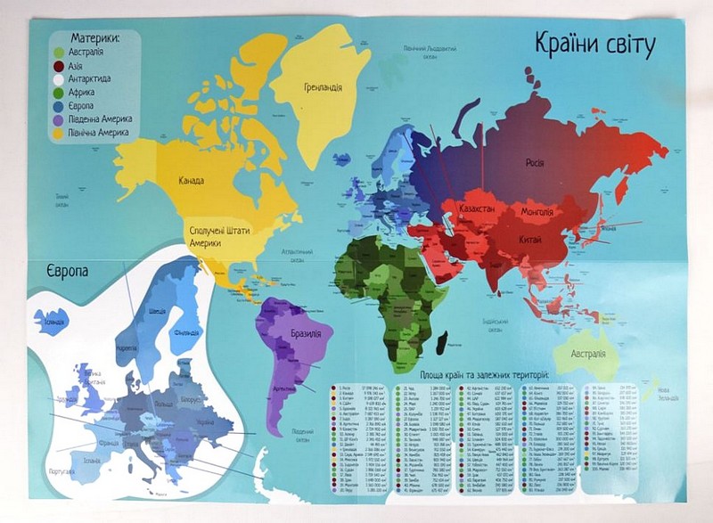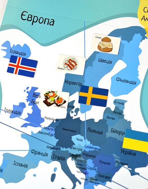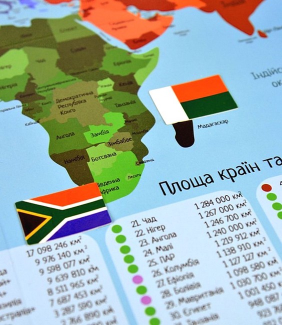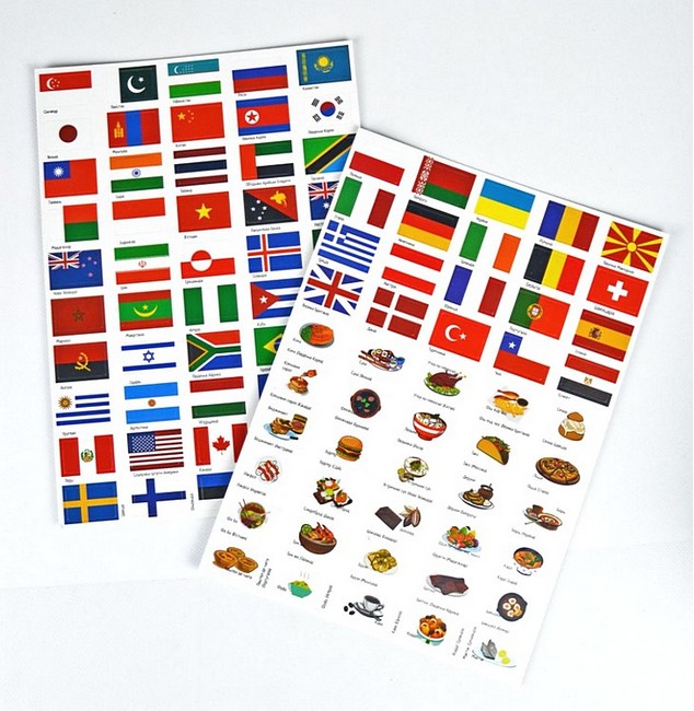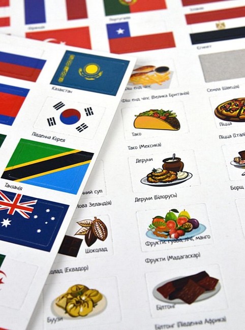 Перед Вами карта світу у виді постеру з багаторазовими наліпками (прапори та національні страви).