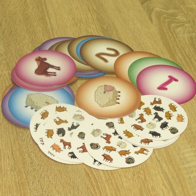 «Ранчо» - весела динамічна гра, розвиває зорове сприйняття, увагу і концентрацію. Ця гра чудово підійде як дітям, так і дорослим. Для гри використовується колода з 70 круглих карток із зображеннями домашніх тварин, а також 10 круглих жетонів (5 жетонів з цифрами і 5 жетонів з тваринами). На нашому ранчо живуть 5 різних видів тварин. Необхідно якомога швидше знайти і порахувати потрібних нам тварин.