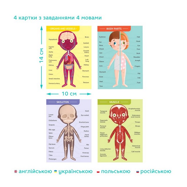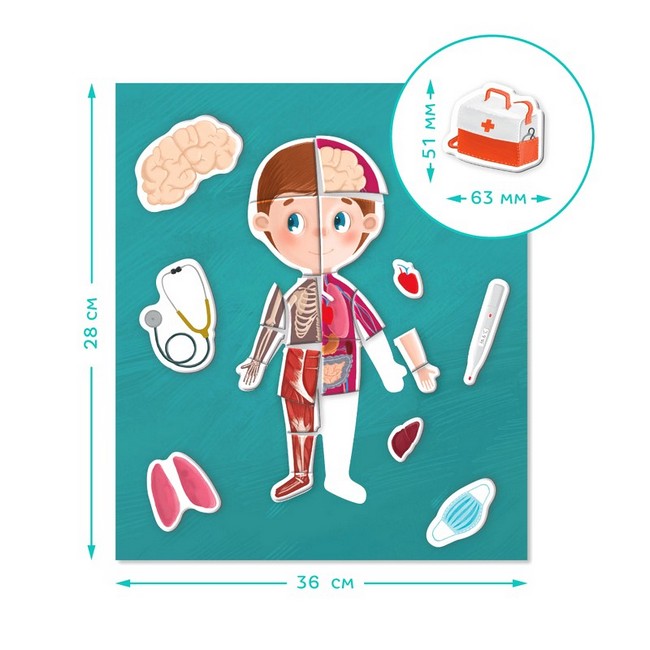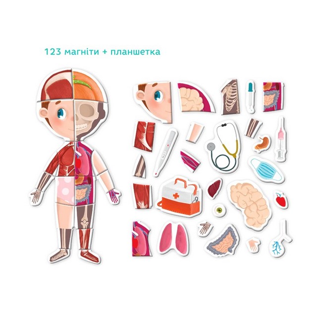 Час дізнатися більше про тіло людини! Вивчаємо будову скелету, назви внутрішніх органів та м’язів з магнітною грою. У наборі: магнітна планшетка з обрисом тіла людини та 123 елементи, на яких можна вивчати будову тіла. Малюки можуть накладати магніти один на одного, вчити нові слова.