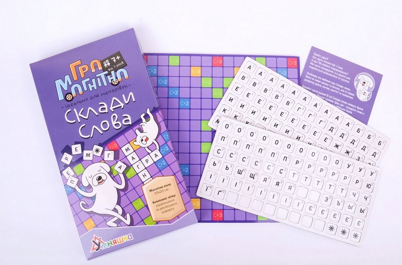 Склад: магнітне поле 20х20см, комплект магнітних букв українського алфавіту.