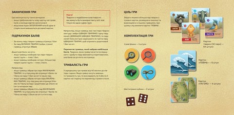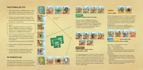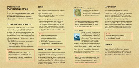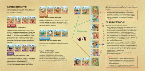 - коробка містить кубики, фішки, картки тварин та унікальні картки «Повінь» та «Пагорб»;