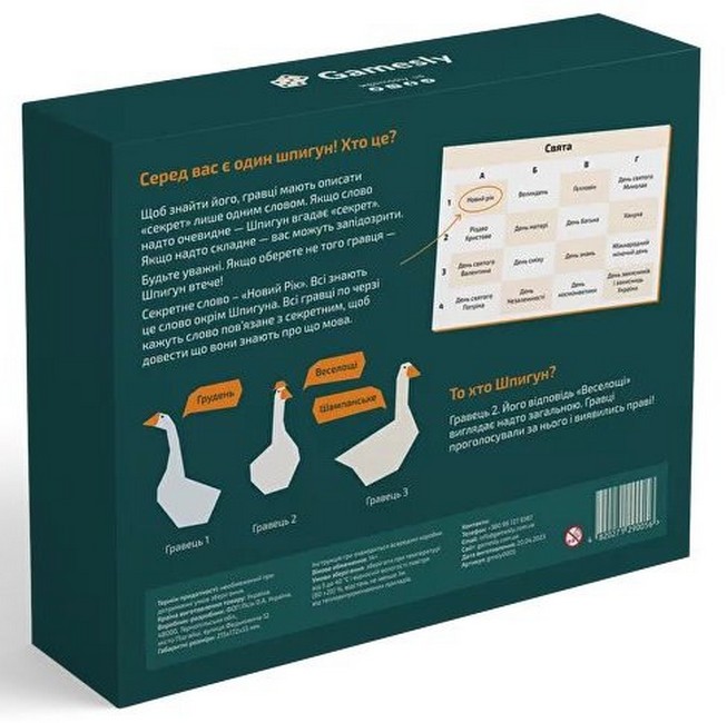 «Знайди шпигуна» – це популярна і надзвичайно цікава настільна гра, у якій учасники намагаються виявити шпигуна серед себе. Ця гра є швидкісною, вона активно розвиває навички спостереження, логіки та комунікації.