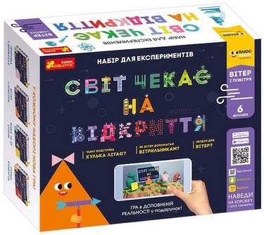 Світ чекає на відкриття Вітер і повітря ПЛЮС-ПЛЮС Ранок. Легенды говорят, что существует таинственный мир, где изобретения ждут, когда их откроют. Современники предполагают, что порталы в это измерение находятся в наборах «МИР ЖДЕТ ОТКРЫТИЕ». Присоединяйся к научным экспериментам и узнавай, как изобретатели учатся у Природы. С помощью специального бесплатного приложения, которое необходимо установить на телефоне или планшете, изображение оживает прямо из коробки. Помогай любимым героям преодолевать трудности в играх с дополненной реальностью. Собирай 4 карточки из разных наборов и начинай Большую Игру настоящих исследователей! В Мире место именно для твоего изобретения! В наборе рассказывается об изобретениях: Пищевой краситель Клей Краски Теплица Микроскоп Капельное орошение Проведи опыты: Как растения пьют воду? Откуда берется крахмал? Что такое неньютоновская жидкость? Что нужно растению для прорастания? Как мы загрязняем воду рек? Как происходит круговорот воды в природе?