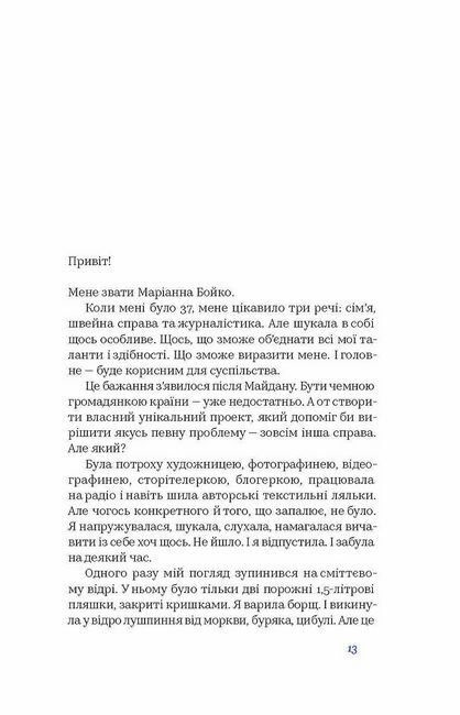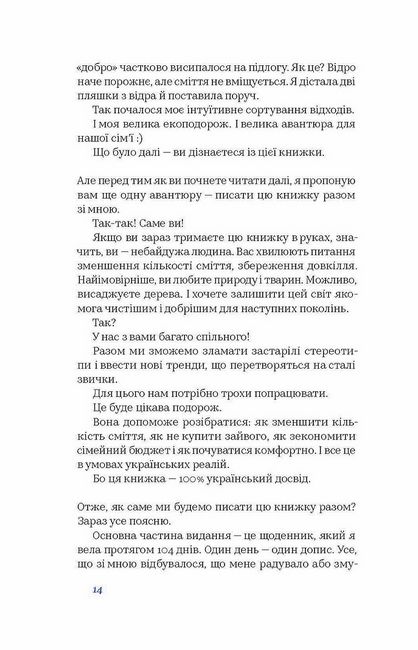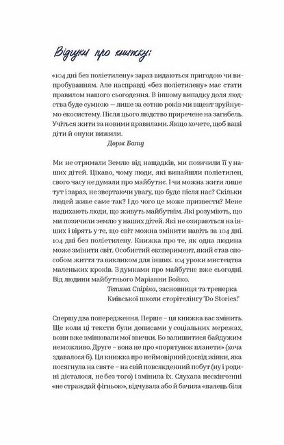 Маріанна Бойко прийняла цей виклик, провівши 104 дні без звичних пластикових речей. Як піти за покупками без жодного пакета? Як бути із шампунями та косметикою? І що робити, якщо турботлива продавчиня на ринку наполегливо пакує вам городину в пакет, здивовано промовляючи: «Доцю, та це ж безкоштовно»? Авторка провела свій експеримент в українських реаліях і охоче ділиться лайфхаками, як не тільки відмовитися від використання поліетилену, а й стати екоблогером і допомагати іншим усвідомити важливість зменшення сміття на планеті.