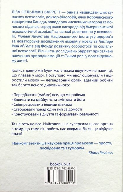 Ліза Фельдман Барретт — одна з найвидатніших сучасних психологів, доктор філософії, член Королівського товариства Канади, володарка численних нагород та почесних відзнак, серед яких: нагорода від Американської психологічної асоціації за вагомі досягнення у психології, Pioneer Award від Національного інституту здоров’я за новаторське дослідження емоцій у мозку та Heritage Wall of Fame від Фонду розвитку особистості та соціальної психології. Більшість досліджень Барретт присвячені вивченню природи емоцій та їхньої ролі у повсякденному житті.