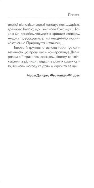Делія Стейнберг зуміла екстрагувати все найкраще з Історії світової Філософії, з якою так добре обізнана. Отож, в її словах чутно відгомін її улюбленного автора Марка Арелія, філософа-стоїка, що відкрив для нас універсальний закон, який пульсує в зоряному небі, що багато сторіч потому виклав іншими словам Кант. Подеколи її войовниче обстоювання свободи індивіда та його соціальної відповідальності нагадує нам мудрість давнього Китаю, що її виписав Конфуцій... Також ми ознайомлюємося з кращим спадком мудрих пресократиків, які неодмінно покликаються на Природу та їх тайнощі...