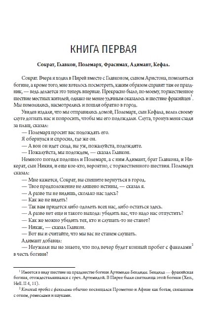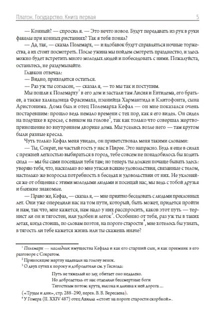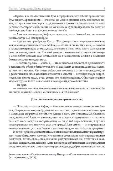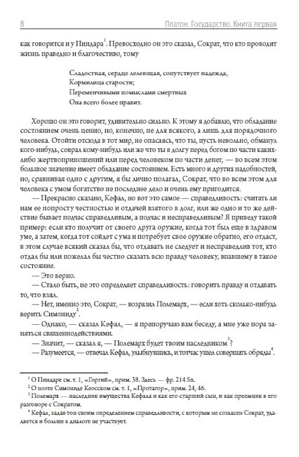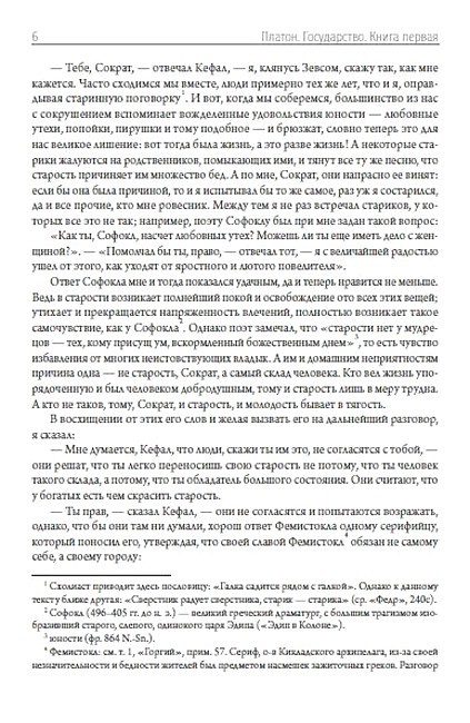 «Государство» — диалог Платона, посвящённый проблеме идеального государства. Написан в 360 г. до н. э. С точки зрения Платона, государство является выражением идеи справедливости. В диалоге впервые отчётливо определяются философы как люди, способные постичь то, что вечно тождественно самому себе. В диалоге содержится систематика и краткий критический анализ видов государственного устройства (идеальное «государство будущего», которое пока не существует, в него не входит), размещённых Платоном на шкале постепенной деградации, которая выглядит как эволюция во времени, но необратимость такой эволюции прямо не утверждается, и сам вопрос неизбежности деградации не поставлен явно, так что при желании эту деградацию можно считать лишь описанием некоторой тенденции, весьма схожей с разложением строя первобытной демократии. Вот эта шкала типов государства (от наилучшего к худшему): Аристократия и монархия, Тимократия, Олигархия, Демократия, Тирания. Платон — автор множества философских трудов: «Хармид», «Эвтидем», «Эвтифрон», «Критиас», «Минос», «Эриксиас», «Алкивиад Первый», «Апология Сократа», «Гиппий больший» и других.