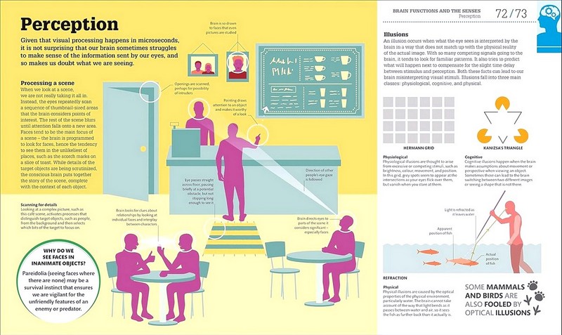 Спираючись на останні дослідження нейронауки, цей візуальний посібник робить приховані роботи людського мозку простими для розуміння. Як працює мозок, починається з ознайомлення з анатомією мозку, показуючи, як сказати свою моторну кору з дзеркальних нейронів. Переходячи до функціонування, він пояснює, як мозок працює постійно і непомітно для регулювання серцебиття та дихання, і як він збирає інформацію для створення досвіду зору, звуку, запаху, смаку та дотику. Глави, що слідують, охоплюють пам'ять і навчання, свідомість і особистість, емоції та спілкування.