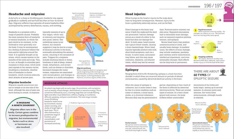 Існує також посібник з розладами мозку, включаючи фізичні проблеми, такі як пухлини та інсульти, психологічні та функціональні розлади, починаючи від аутизму до шизофренії. Проілюстрований сміливою графікою та покроковими творами мистецтва та переповнений фактоїдами розміру укусу та особливостями запитань та відповідей, це ідеальне знайомство із захоплюючим світом людського мозку.