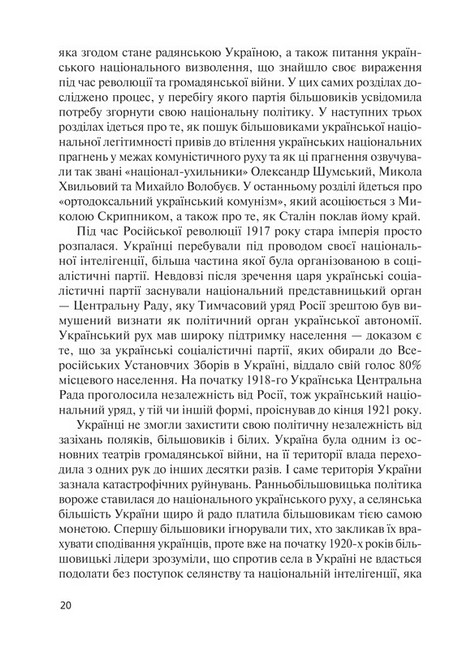 Століття тому спроба реалізувати український національний проект у межах СРСР могла здатися досить вдалою: політика українізації зумовила швидке зростання рівня письменності, поширення української мови в містах, надзвичайне піднесення культури, а уряд УСРР мав широкі повноваження в галузі економіки. Але так було недовго: всеохопна насильницька колективізація та штучний голод у регіонах, населених українцями, арешти, розстріли й цькування українських політиків та інтелігенції, стрімке повернення до російськоцентризму та поширення шовіністичних настроїв засвідчили: СРСР - та сама Російська імперія під новою назвою. У класичній розвідці Джеймса Мейса читач знайде концентрований, послідовний і захопливий огляд ідей та подій 1918-1933 років - досвіду, що зараз актуальніший, ніж будь-коли.