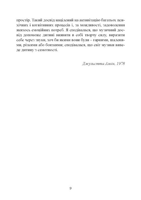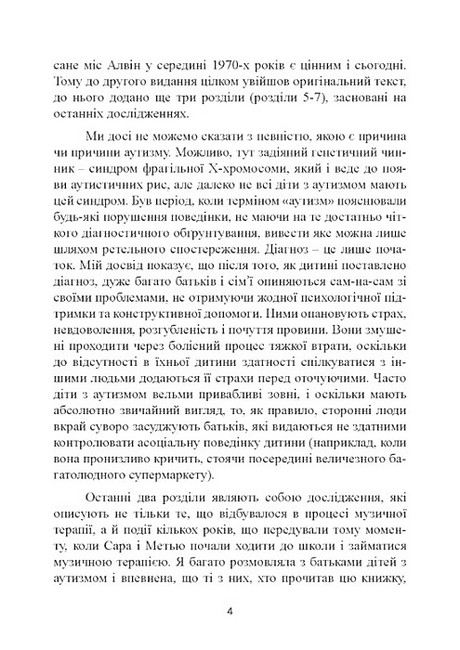 У книзі докладно описано конкретні методики роботи музичного терапевта з дітьми з різним ступенем вираженості аутизму. Опис психотерапевтичного процесу систематизовано, автор виділяє окремі етапи роботи. Методики супроводжуються прикладами з практичних занять Дж. Алвін, яка однією з перших застосувала музику в роботі з аутичними дітьми. Книгу відредаговано і доповнено Е. Уорік, віце-президентом Британського Товариства музичних терапевтів. Велику увагу приділено участі батьків, описуються шляхи вирішення багатьох проблем на спільних заняттях.