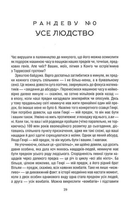 Від сучасних людей до мікробних зародків, по скам’янілих рештках прадавніх тварин, слухаючи історію далекого предка-мавпи чи химерної асцидії, плодової мушки або еубактерії. Ця книга — подорож, що проливає світло на такі теми, як еволюція видів, природний відбір, вимирання цілих популяцій тощо.