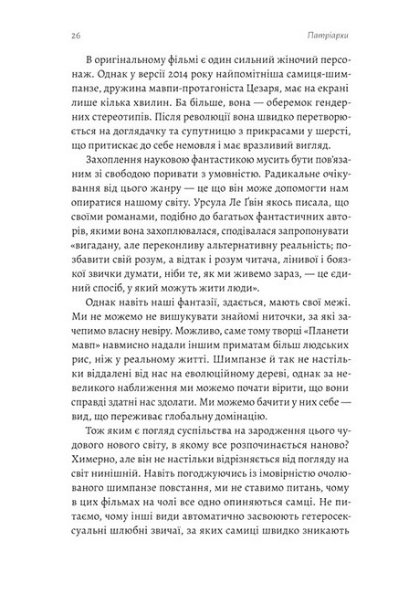 У наш час, попри боротьбу з сексизмом, насильством і дискримінацією, навіть революційні зусилля, спрямовані на досягнення рівності, часто закінчуються невдачею. Але «Патріархи» вселяють надію — відкривають множинність людських устроїв, підважують старі наративи й викривають чоловічу зверхність як постійно мінливий елемент системи контролю.
