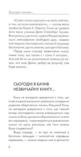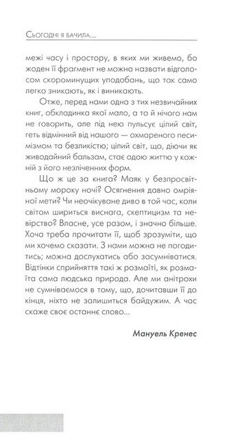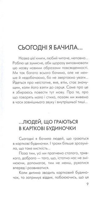 "Сьогодні я бачила..." — книжка особлива. Написана прозою, вона не поступається будь-якому відомому поетичному творові, оскільки її слова напрочуд невимушено заторкують найпотаємніше в кожній людині. Ця книга, написана у жанрі роздумів про наболілі питання сьогодення, виходить за межі часу і простору, в яких ми живемо, бо жоден її фрагмент не можна назвати відголосом скороминущих уподобань, що так само легко зникають, як і виникають. Отже, перед нами одна з тих незвичайних книг, обкладинка якої мало, а то й нічого нам не говорить, але під нею пульсує цілий світ, геть відмінний від нашого — охмареного песимізмом та безликістю; цілий світ, що, діючи як живодайний бальзам, стає одою життю у кожній з його незліченних форм.