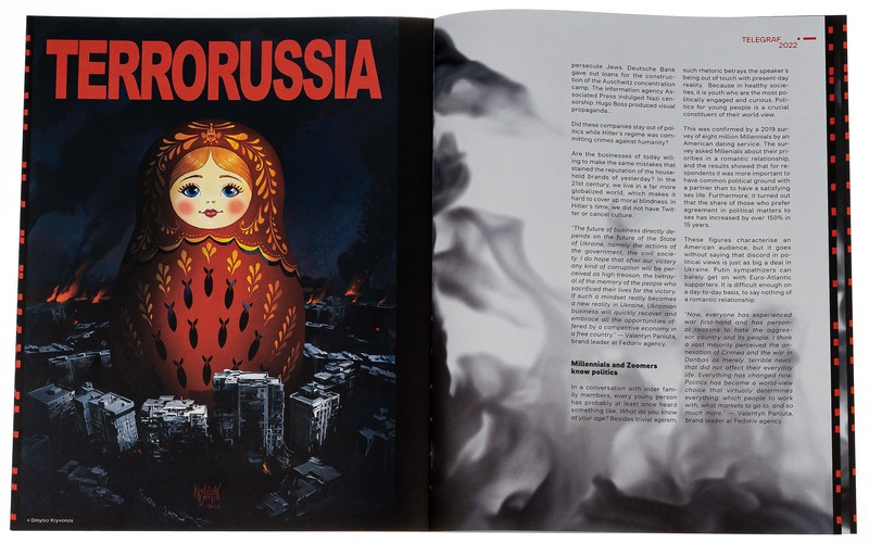 Артбук Telegraf. Creativity of the Brave —це візуальна рефлексія реальності, в якій живуть українці з 24 лютого 2022. Професійний переклад артбуку на англійську містить примітки, коментарі та розширені пояснення, щоб іноземні читачі змогли глибше зануритися в контекст життя під час війни, зрозуміти символи та емоції українців. Дизайн журналу втілив чимало атрибутів війни. Вибухи й дим, перетини блок-постів між розділами. Нумерація сторінок, що починається з 05:00 24 лютого, коли люди почали прокидатися від вибухів по всій країні. Повітряні тривоги, світломаскування, шрифт, що стрілочкою вказує де укриття. Поруч з війною журнал розкриває образ української креативної спільноти: особисті історії людей, що опинилися в окупації, в евакуації, на фронті.