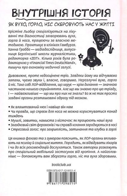 Ця книжка фахово та з гумором пояснить, як ЛОР-органи впливають на психіку й соціальне життя. Порадить, як відвідувати лікарів і чи до всіх рекомендацій дослуха?тися. Також авторки розкажуть про спеціальний мобільний застосунок від хропіння. А найголовніше — допоможуть вам зберегти горло, ніс та вуха здоровими.