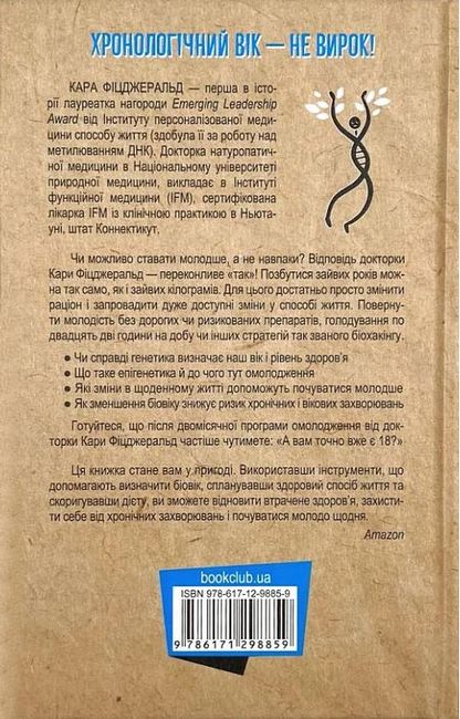 Ставати щодня молодше, а не навпаки… Якась магія? Ні, підтверджена наукою реальність. Бо ж хронологічний вік - не вирок, коли можна повернути назад біологічний годинник. Докторка Кара Фіцджеральд переконує: позбутися зайвих років можна так само, як і зайвих кілограмів. Для цього достатньо просто змінити раціон і запровадити дуже доступні зміни у способі життя. Повернути молодість без дорогих чи ризикованих препаратів, голодування по двадцять дві години на добу чи інших стратегій так званого біохакінгу.