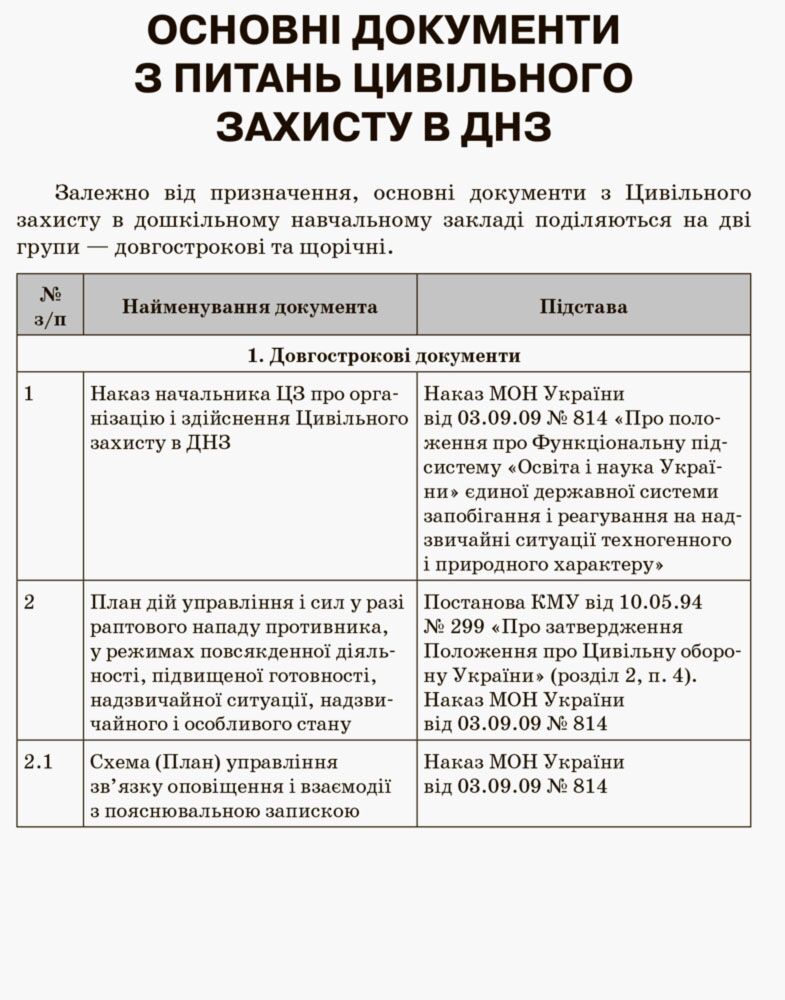 Посібник містить зразки обов’язкової документації із цивільного захисту в ДНЗ, сценарій проведення Тижня безпеки дитини, конспекти занять, пам’яток з безпеки життєдіяльності. Матеріал посібника рекомендований для використання керівникам ДНЗ, батькам, вихователям.