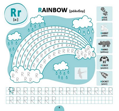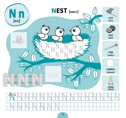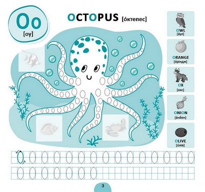 Цей зошит містить прописи букв англійського алфавіту. На кожній сторінці на дитину чекає асоціативний малюнок до літери, який потрібно навести по пунктиру й розфарбувати, а ще — прописи зі зразком написання певної букви та слова, що поповнять лексичний запас англійської мови. Урізноманітнять роботу з виданням тематичні наліпки та цікаві завдання, які допоможуть перевірити знання нових слів, графічного зображення літер та уміння їх писати.