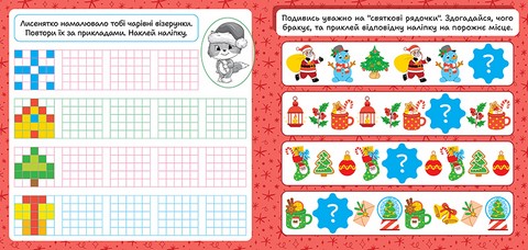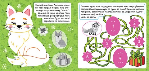 Ця книга запрошуює маленьких читачів поринути в казковий світ передсвяткових пригод. Разом із веселими й кмітливими персонажами діти виконуватимуть цікаві завдання для розвитку логіки, уваги і пам’яті. Яскраві, барвисті ілюстрації, що доповнюються інтерактивними наліпками, спонукатимуть малюків до застосування просторового й образного мислення.
