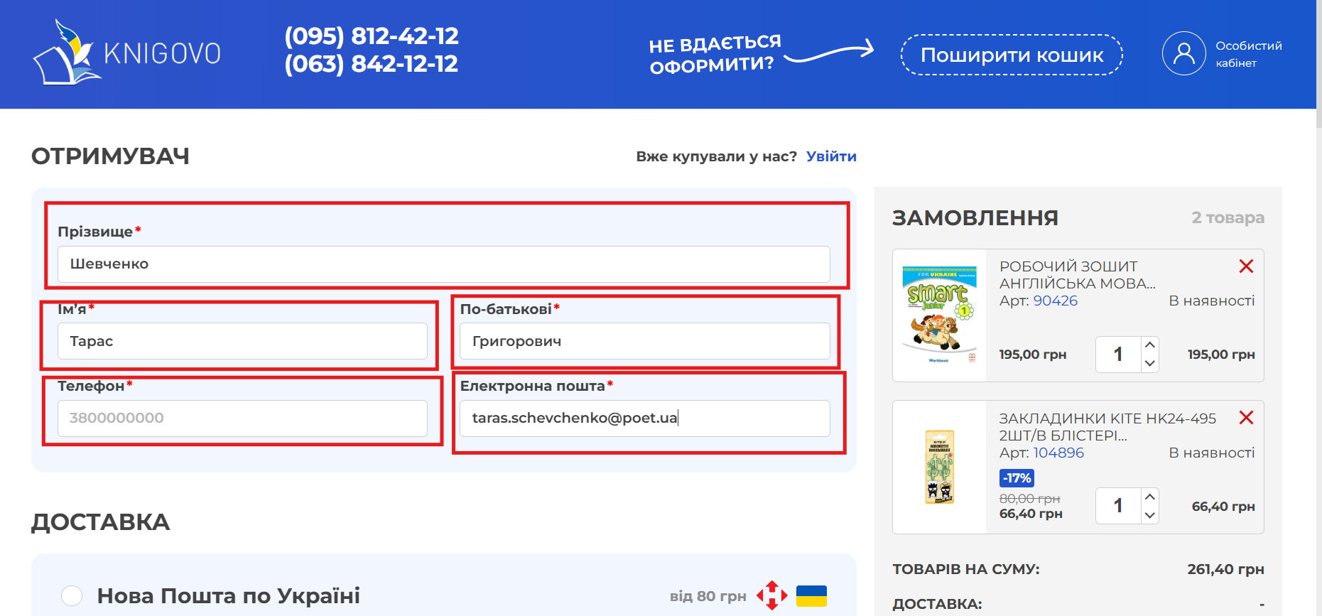 3. Введіть особисті дані. Для того щоб відправити замовлення, нам необхідно мати дані про отримувача посилки. ПІБ, номер телефону, електронну пошту, адресу доставки, тощо. Введіть ці данні у відповідні поля або авторизуйтесь на сайті, якщо вже щось купували у нас раніше. Заповніть також усі обов'язкові поля.