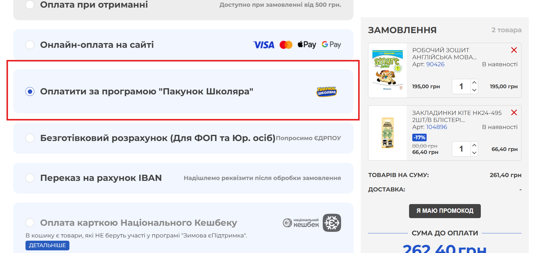 Як оплатити замовлення за програмою "Пакунок школяра"?