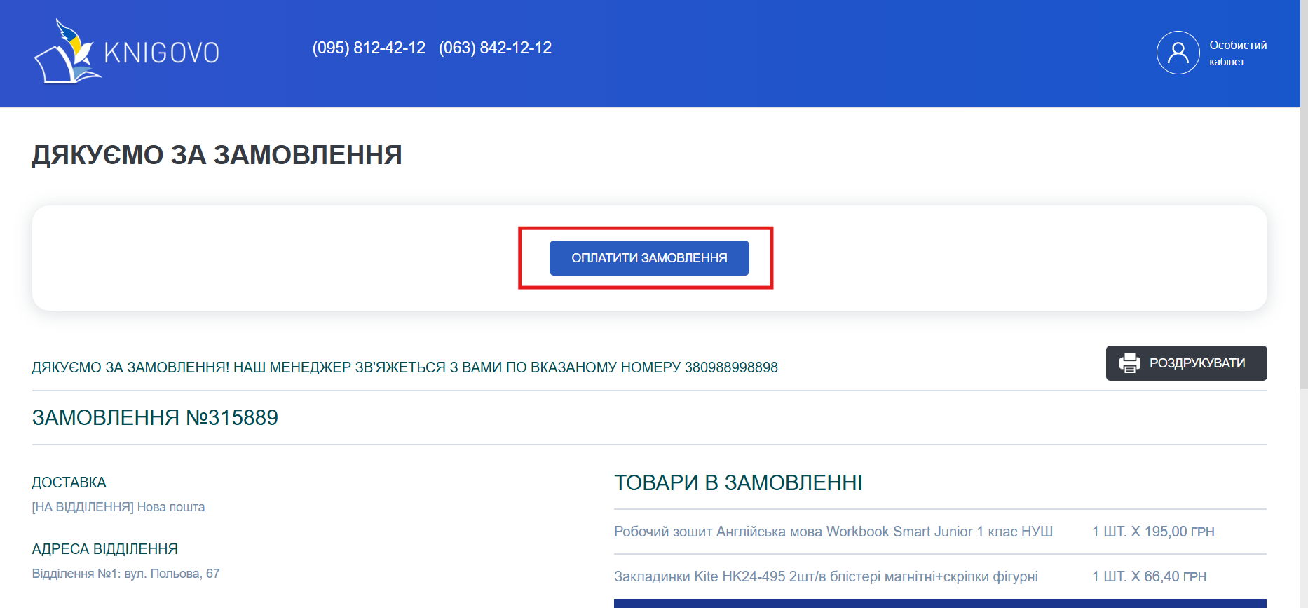 7. Завершіть оплату. Після завершення оплати Ви побачите повідомлення про успіх. На цьому етапі замовлення вже оплачене та Вам потрібно просто зачекати, поки склад обробить його.