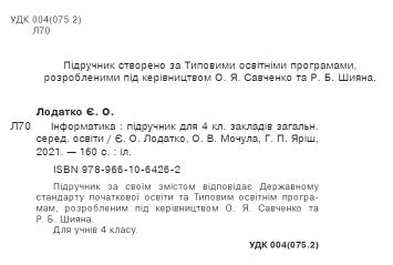 Підручник Інформатика 4 клас НУШ Є. Лодатко, О. Мочула, Г. Яріш Богдан