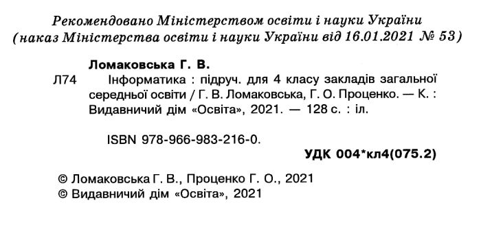 Підручник Інформатика 4 клас НУШ Ломаковська Г. Освіта. Створений відповідно до вимог Типової освітньої програми. Нова українська школа.