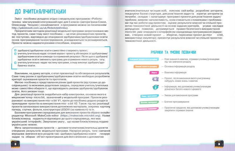 Зміст посібника укладено згідно з модельною програмою «Робототехніка: міжгалузевий інтегрований курс для 5 класів» (автори Ірина Сокол, Олександр Ченцов).